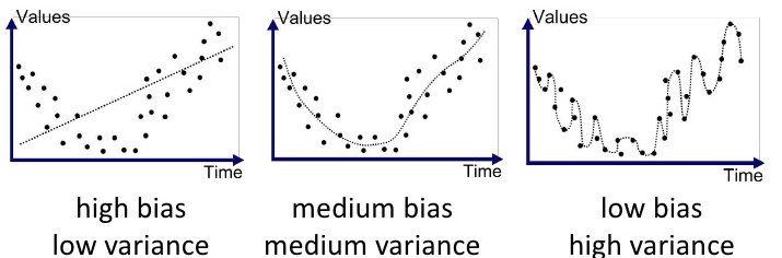아래 그림은 overfitting과 underfitting을 설명하는 대표적인 예시입니다. 왼쪽은 underfitting된 모델로 비선형적인 데이터 분포를 선형 모델로 퉁치려는 모습입니다. 따라서 편향된(high bias & low variance) 모델이라 할 수 있고 반대로 오른쪽 그림은 주어진 데이터에 너무 과도하게 fit된 모습을 보이고 있습니다. 때문에 분산이 큰(high variance & low bias) 모델이라 할 수 있겠습니다. 결국 우리가 해야되는 것은 가운데 그림처럼 적절한 편향성(bias)과 적절한 분산(variance)을 가지는 optimum level의 모델을 찾아야 하는 것입니다.