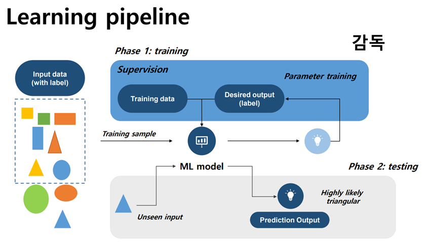 학습은 크게 두 가지 과정을 거치게 됩니다. 첫번째는 training 과정으로 주어진 학습 데이터(training data)로 학습을 진행하는 것입니다. 그리고 두번째는 testing 과정으로 학습된 모델을 통해 unseen input(혹은 testing data)을 입력하여 예측을 진행하는 것입니다. 이때, 첫번째 training 과정이 핵심인데 supervised learning에서는 training data를 입력 받아 output을 출력하게 되면 출력된 output을 desired output(우리가 가지고 있는 정답(label))과 비교하여 error를 찾아내게 됩니다. 그리고 이 error를 줄이는 방향으로 parameter들을 변경해 나가며 model을 교정하게 됩니다. 즉, supervised learning에서는 우리가 가지고 있는 정답과 모델이 내놓은 예측값을 비교해가며 모델이 정답에 가까운 예측값을 출력할 수 있도록 학습을 시키는 것이라고 정리할 수 있습니다.
