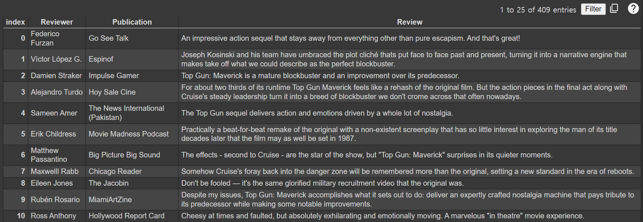 리뷰 스크래핑을 위한 모든 준비가 되었으니 본격적으로 리뷰를 가져와 보도록 하겠습니다. 최근 '탑건-메버릭'이라는 영화가 개봉되었는데 영화 '탑건'을 예시로 하여 스크래핑을 진행해보도록 하겠습니다. (리뷰 작성일 기준 총 409개의 리뷰가 있었습니다.)