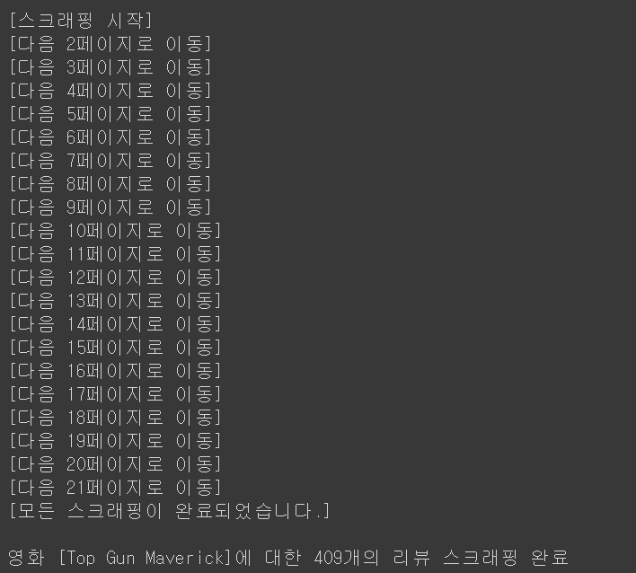 첫 페이지에서 20개의 리뷰를 모두 추출하여 dataframe으로 변환하였으면 앞서 만든 page_click() 함수를 호출하여 다음 페이지로 넘어갑니다. 그리고 while문 반복을 통해 20개의 리뷰를 추출하고 페이지를 넘어가는 과정을 반복합니다. 더 이상 페이지를 넘어갈 수 없다면(next 버튼이 존재하지 않는다면) 예외처리를 통해 반복을 break 하겠습니다. 리뷰가 정상적으로 스크래핑이 되고 있는지 육안으로 확인하기 위해 스크래핑 시작, 페이지 이동을 알리는 메시지들과 최종적으로 스크래핑을 진행한 영화의 리뷰가 총 몇 개 나왔는지 메시지를 출력하겠습니다.