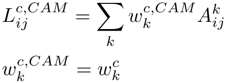 CNN의 최종 layer의 해상도는 다소 떨어지기 때문에 upsampling을 통해 최종 시각화를 진행하게 됩니다. 아래 식은 class C에 대한 cam 결과를 나타낸 것입니다. summation 안의 A값은 activation map에 대한 값을 말하며 w값은 선형 이에 선형 결합되는 가중치값입니다. 위의 gap layer을 표현한 식이라고 생각하면 됩니다.