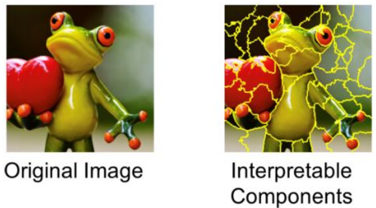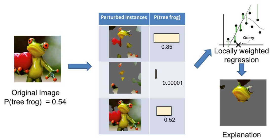 lime은 매우 복잡한 비선형적인 특징을 보이는 classifier들이 local하게는 선형적인 모델로 근사화가 가능하다는 아이디어에서 착안되었습니다. 주어진 데이터를 조금씩 교란(perturbate)해가며 이를 모델에 여러번 통과시키며 나오는 출력을 보고 입출력 pair를 간단한 선형 모델로 근사하여 설명을 얻어내는 방법입니다. model-agnostic하고 black-box한 설명이라는 특징을 가지고 있습니다. 가령, 이미지를 여러 super-pixel들로 나눈 다음 분리된 super-pixel들 중 random하게 선택하여 이미지를 교란시킵니다. 그리고 perturbed된 이미지를 모델을 통해 예측하고 예측된 결과에 대한 확률을 비교합니다. 아래 그림과 같이 각 perturbed된 이미지에 대한 확률들이 다르게 나타나는데 이미지와 확률의 pair을 통해 선형계수를 학습합니다. 선형계수들을 통해 개구리 class로 예측할 때 중요한 역할을 한 super pixel들을 최종적으로 설명해낼 수 있게 됩니다.