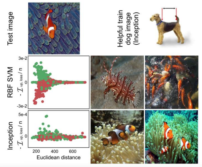 하나의 예시로 RBF 커널을 사용한 SVM model과 cnn기반의 Inception model을 가지고 니모 물고기(test image)를 분류하는 작업을 진행했다고 가정해보겠습니다. 이 두 모델이 test image를 분류하는 데 사용한 기준은 서로 상이합니다. RBF SVM model의 경우 단지 색깔이 비슷한 이미지들을 가지고 test image에 대한 예측을 진행하였습니다. 니모 물고기와는 전혀 다른 종의 물고기이지만 색깔은 같은 엉뚱한 이미지를 기준으로 분류를 한 것입니다. 반면, Inception 모델의 경우 test image와 같은 종인 니모 물고기를 기준으로 분류 결과를 예측해냈습니다. 이처럼 분류 작업에 큰 영향을 미친 data를 통해 모델의 예측을 설명해낼 수 있고 그것이 합리적인지를 확인하여 model이 잘 학습되었는지 판단할 수 있습니다.