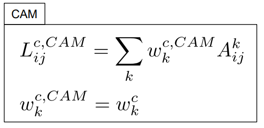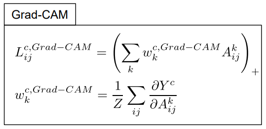Grad-CAM은 CAM의 단점을 극복하여 gap이 없어도 적용이 가능한 방법입니다. 아래식을 비교해보면 grad-cam의 경우 cam과 달리 weight 값을 마지막 convolutional layer에서의 값을 사용하지 않습니다.