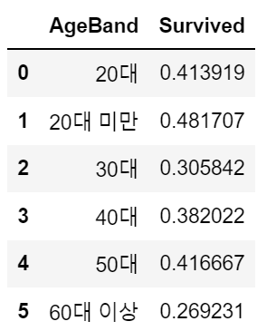 df.loc[(df['Age'] >= 20) & (df['Age'] < 30), 'AgeBand'] = '20대'