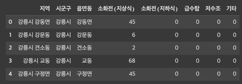 fire_df_new.columns = ['지역', '시군구', '읍면동', '급수탑', '기타', '소화전(지상식)', '소화전(지하식)', '저수조']