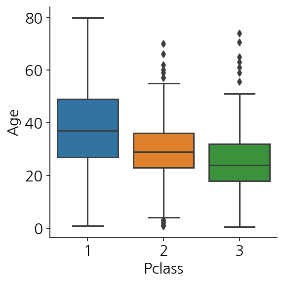 sns.catplot(data=df, x="Pclass", y="Age", kind="box", height = 4, aspect = 1);