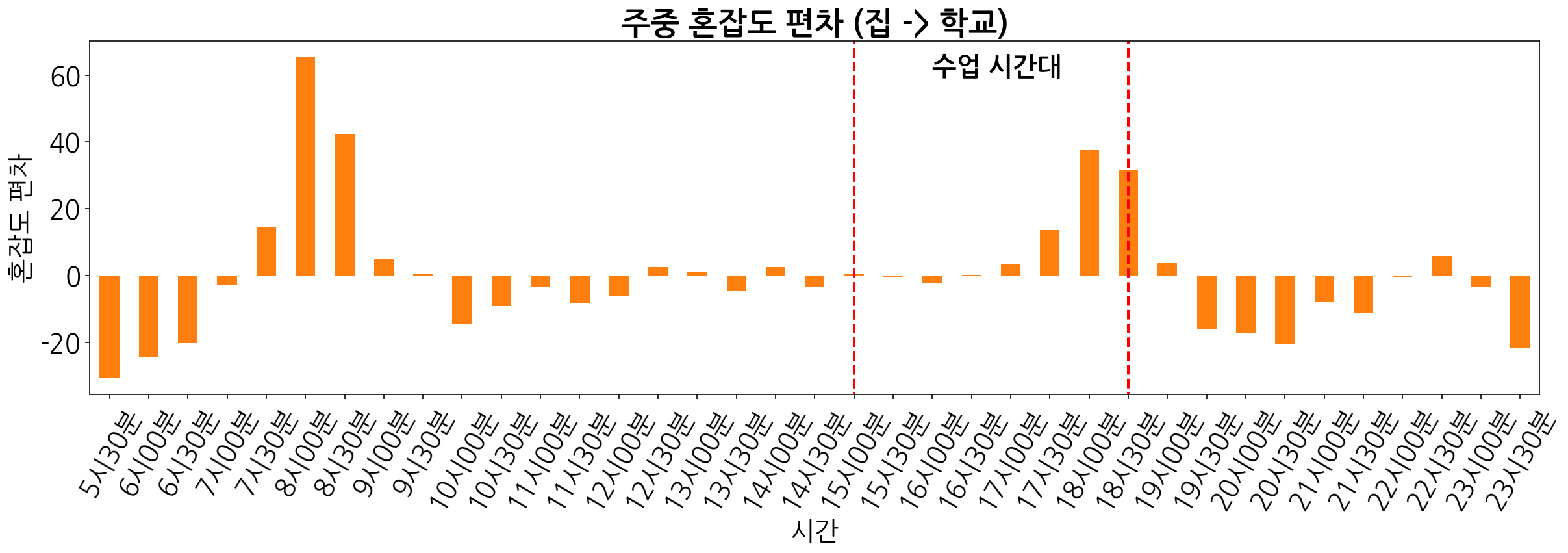 a.set_title('주중 혼잡도 편차 (집 -> 학교)', fontweight = 'semibold')
