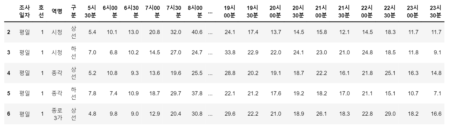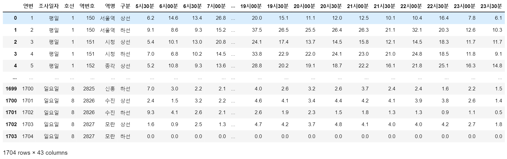 수집한 csv파일을 데이터프레임으로 불러와 확인해보겠습니다. 데이터에는 총 1704개의 인스턴스와 43개의 컬럼으로 구성되어 있습니다. 전체 컬럼 중 앞의 6개 열은 '연번', '조사일자', '호선', '역번호', '역명', '구분'이며 이를 제외한 나머지는 5시 30분부터 23시 30분까지 30분 단위의 시간 간격입니다.