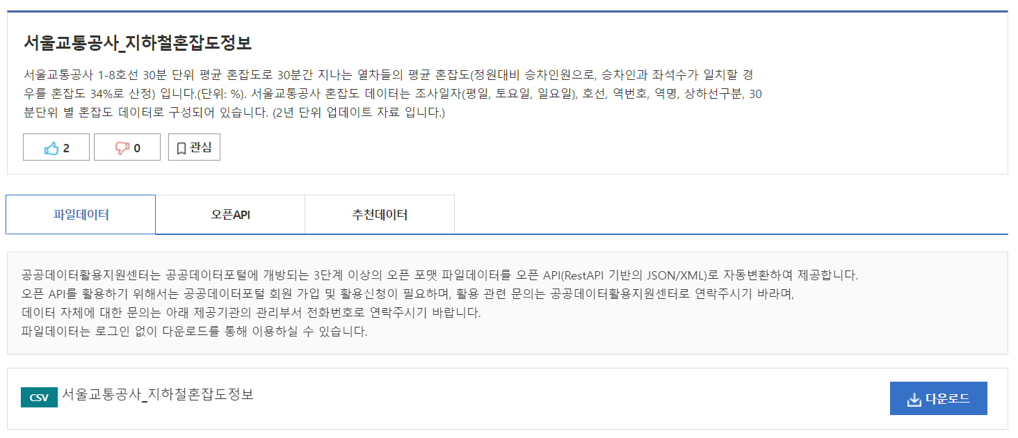 하지만 정말 운이 좋게도 이번 분석에 필요한 데이터를 단번에 구할 수 있었습니다. 서울교통공사에서 제공하는 '지하철 혼잡도 정보'인데 정확히 제가 원하는 분석 지표를 포함한 데이터입니다. 만약 이 데이터가 없었더라면 '시간대별 지하철 이용객' 이나 '호선별 지하철 수용량' 등의 데이터를 구해 분석 지표를 집계하여 새로운 데이터를 만들어야 했을 것입니다. 물론, 수집해야 할 데이터 수가 많아짐에 따라 필요한 데이터를 구하지 못하는 경우도 발생했을 것입니다. 여하튼, 필요한 데이터를 수집했으니 데이터에 대한 설명을 확인해보겠습니다.