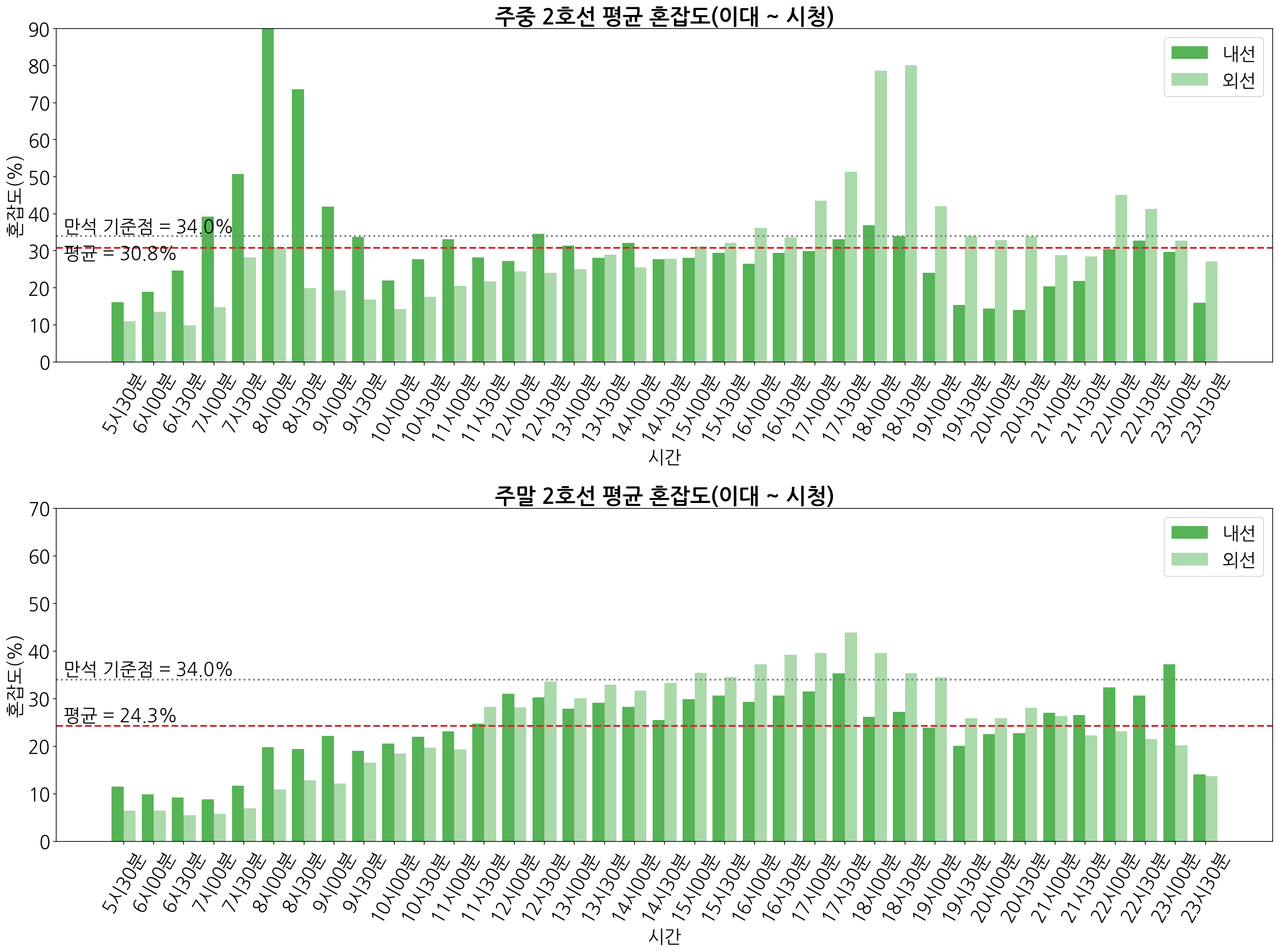 주중, 주말 혼잡도 편차 그래프를 그려보면 아래와 같이 나타나게 됩니다.