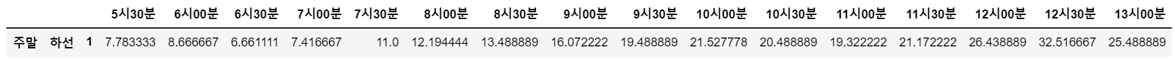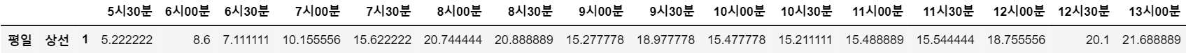 df_we_up_1 = pd.DataFrame(df_1.iloc[0,:]) #주말 1호선 상선 혼잡도