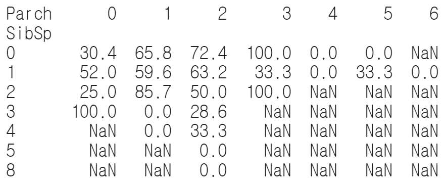 Parch와 SibSp를 각각 index와 column으로 하는 pivot table을 그려보았습니다. 앞서 설명에서는 crosstab이라고 말씀 드렸는데 지금 보니 pivot table을 그렸던 것으로 보입니다. 사실 crosstab이 pivot table의 일종이기 때문에 그다지 큰 차이는 없습니다. 그리고 여기서는 groupby 집계 후에 pivot()함수를 사용하였는데 이를 한번에 pivot_table()로 처리(aggfunc = 'mean')할 수도 있습니다.