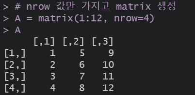 앞서 matrix()의 파라미터를 통해 열 우선 배열을 행 우선 배열로 설정할 수 있다고 했는데 다음의 결과를 통해 확인해보겠습니다. 위의 결과와 달리 1,2,3,4,5,6,7,8... 의 배열이 행을 기준으로 나열되어 있습니다. 이처럼 byrow = TRUE를 설정해주면 열 기준의 배열을 행 기준의 배열로 바꿀 수 있습니다.