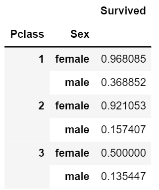pd.DataFrame(df.groupby(['Pclass', 'Sex'])['Survived'].mean())