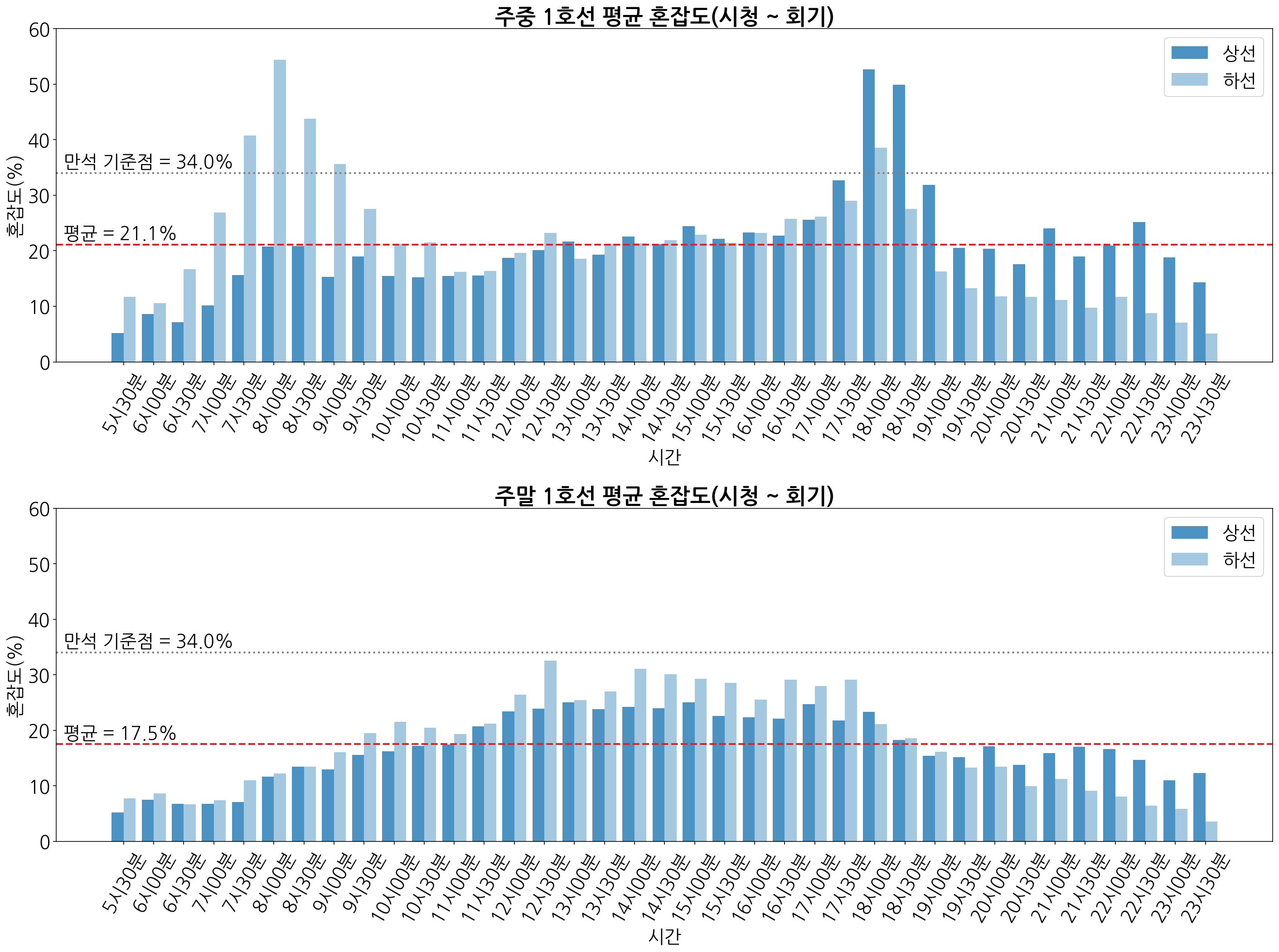 혼잡도 추가 설명 : 지하철 1칸의 정원은 160명으로 이를 기준 삼아 혼잡도(%)를 산정하게 됩니다. 즉, 지하철 1칸에 160명이 차게 되면 혼잡도 100%입니다. 한편, 지하철 1칸에는 7인용 좌석 6개, 노약자석 3인용 4개가 있어 총 54개의 좌석이 있습니다. 따라서, 모든 좌석에 한 사람씩 앉아 54명이 찼을 경우 34%의 혼잡도가 나오게 됩니다.
