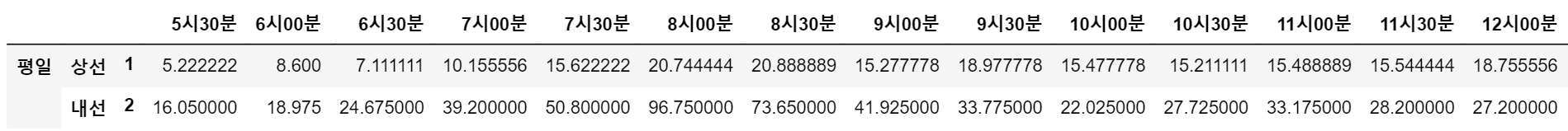 전처리 작업을 마쳤으니 본격적으로 분석을 진행 해보겠습니다. 우선, 어떤 내용을 확인하고 싶은지 구체화하여 정리해보고 이에 따라 데이터를 정리해보겠습니다. 최적의 지하철 통학 시간대를 결정하기 위해서는 시간대별 지하철 혼잡도를 파악해야 합니다. 이때, 정확한 분석을 위해서는 데이터를 범주에 따라 그룹화하여 살펴보아야 합니다.