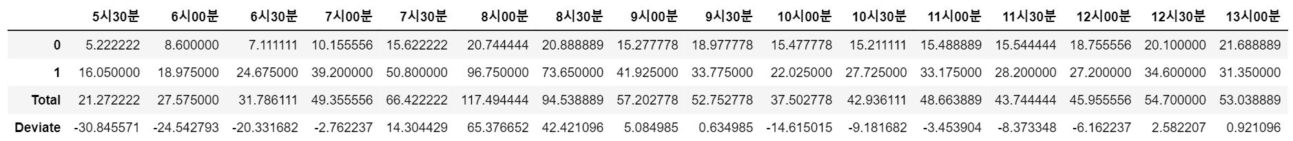 weekday_tohome.loc['Deviate', :] = weekday_tohome.loc['Total', :] - mean