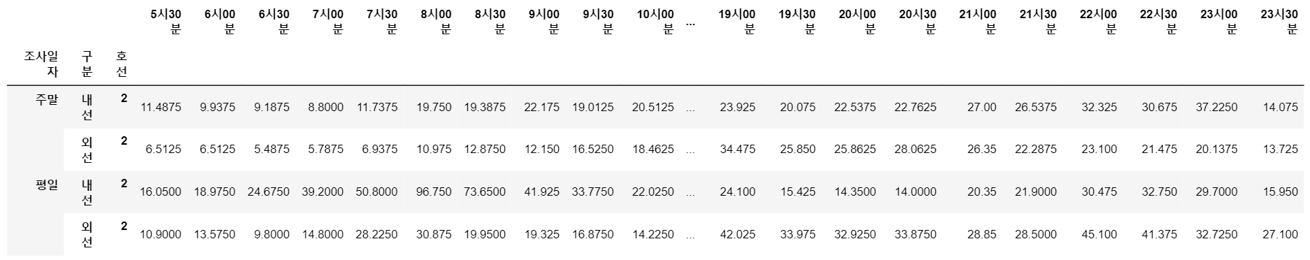 그리고 데이터를 '시간(조사일자)'과 '방향(구분)'에 따라 그룹화하도록 하겠습니다. 그러면 아래와 같이 '주말/평일' 그리고 '상선/하선'에 따라 데이터가 그룹화되어 정리될 것입니다.