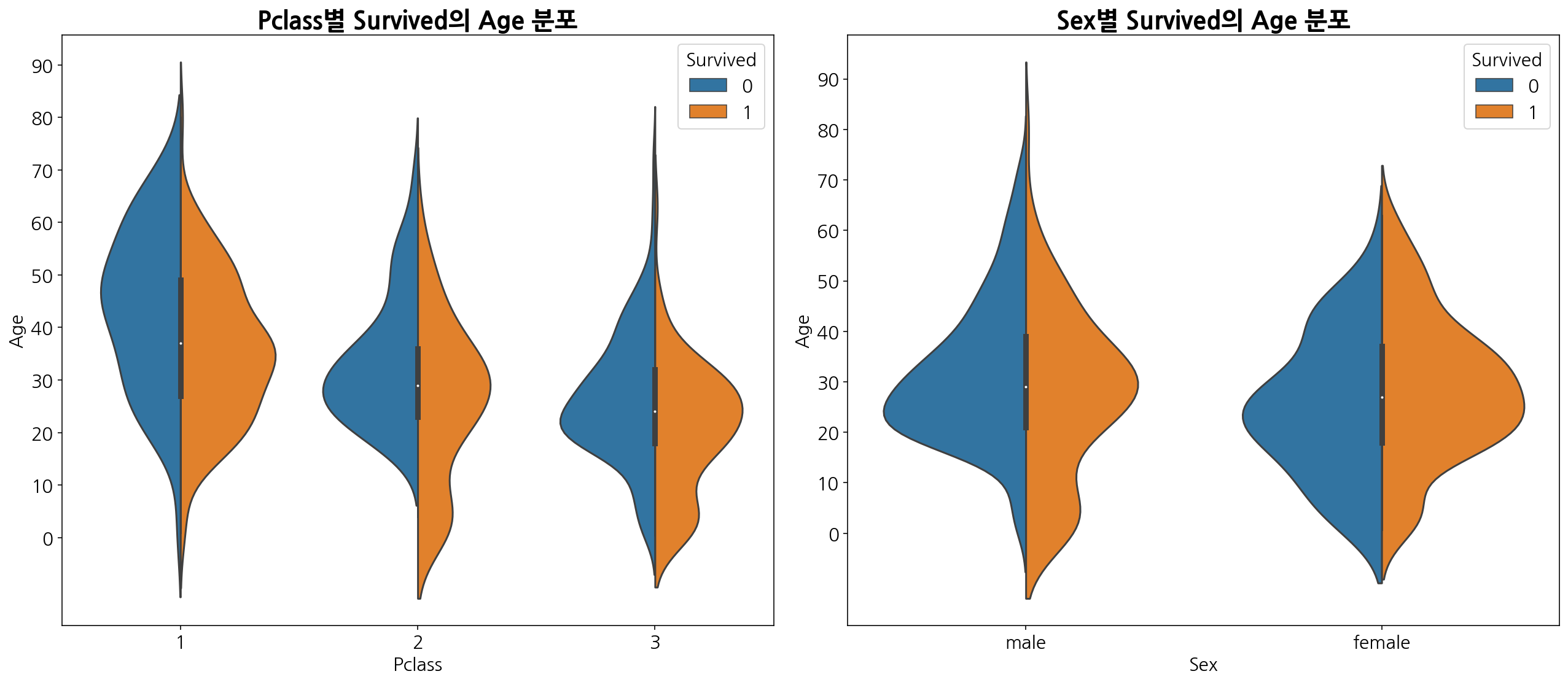 Graph1) 생존자 연령 분포에 대한 Violin Plot(바이올린 플롯)