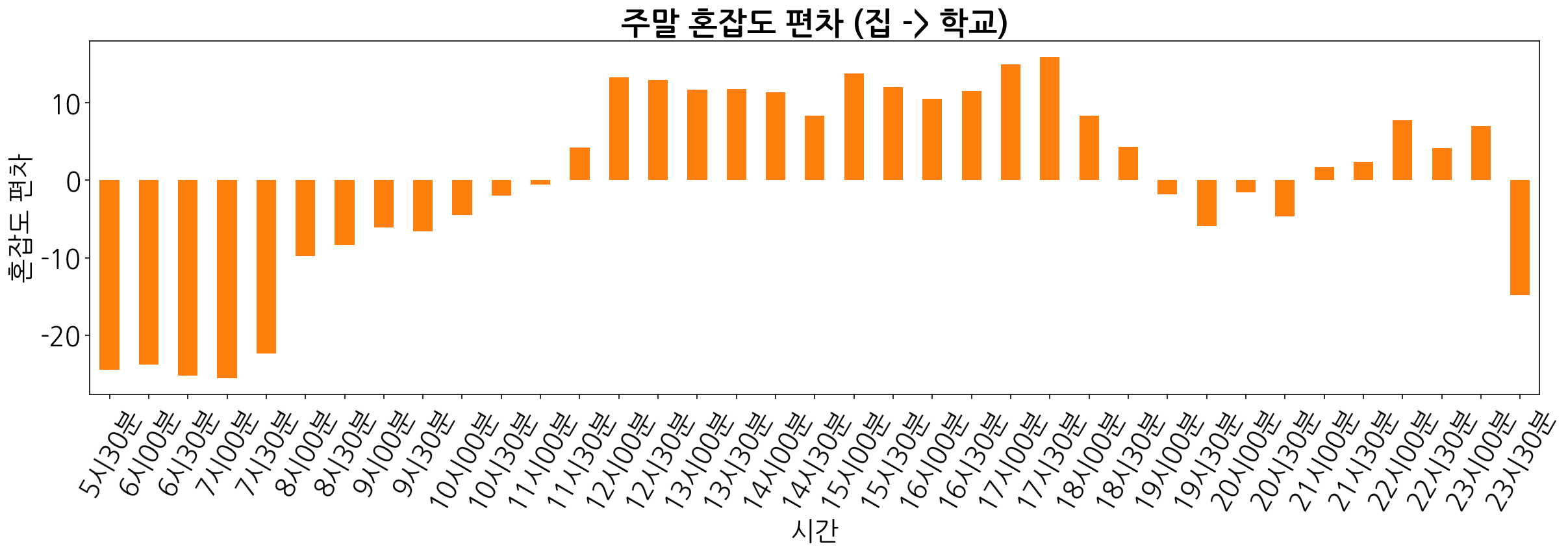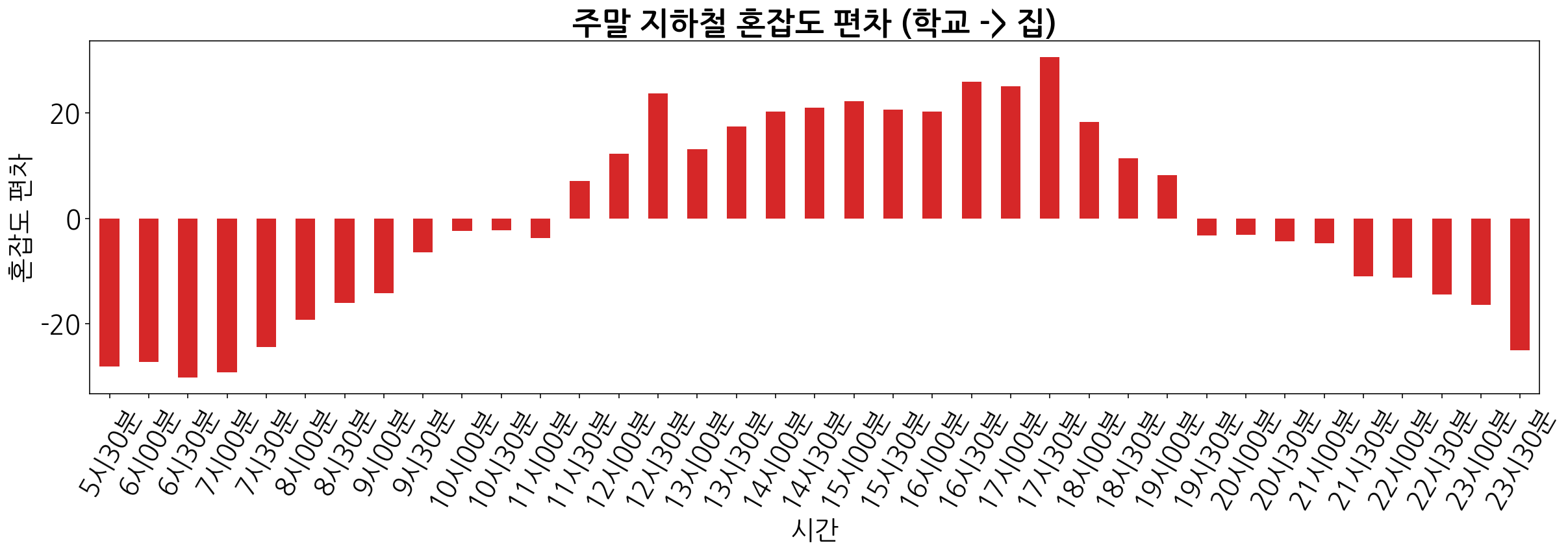 주중, 주말 혼잡도 편차 그래프를 그려보면 아래와 같이 나타나게 됩니다.