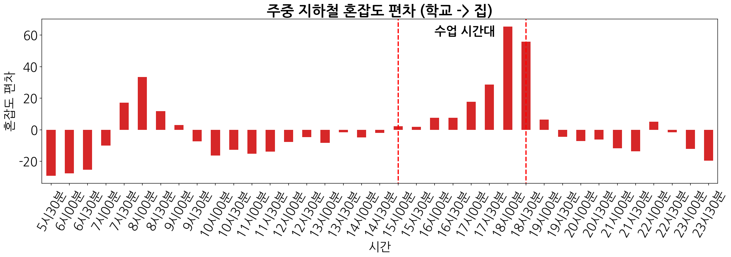 위에서 도출한 편차 그래프를 통해 최적의 지하철 통학 시간대를 파악해보겠습니다. 오렌지 색깔로 된 그래프는 집에서 학교로 통학하는 경우이며 아래 빨간색 그래프는 학교에서 집으로 가는 경우입니다.