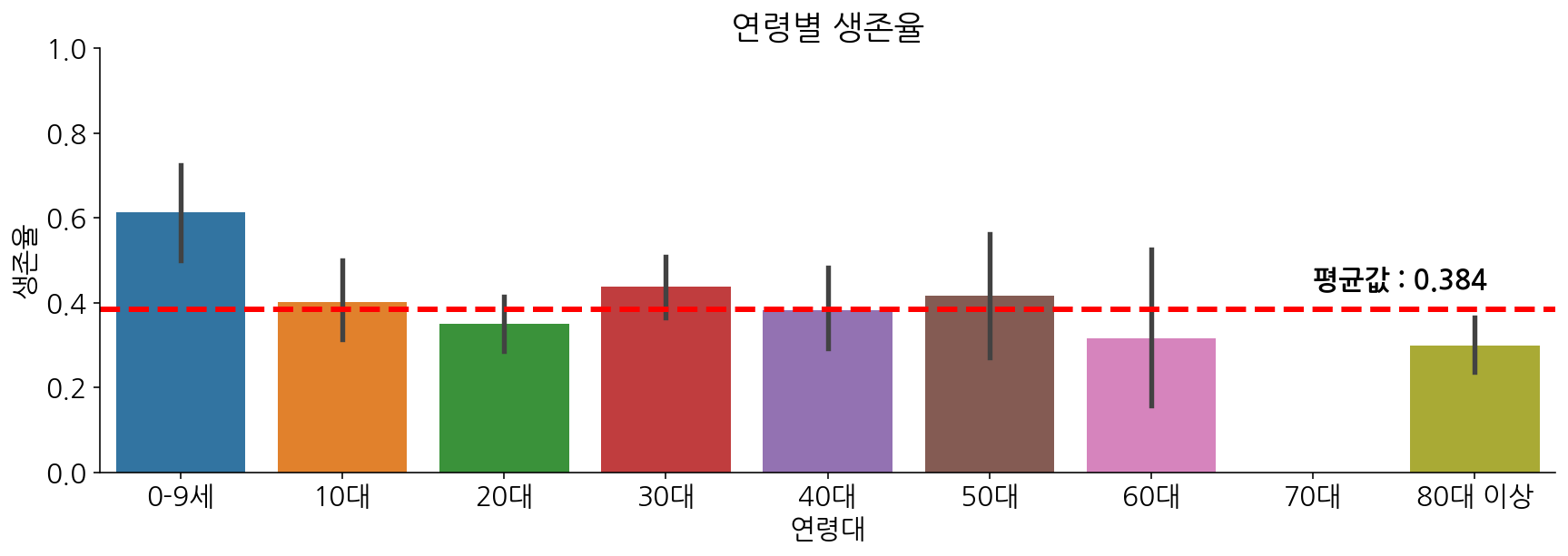 분석 :10대 이하, 80대 이상을 제외하고 대부분의 연령대는 평균 생존율에 근사해 있습니다. 70대의 경우에는 생존자가 없으며, 10대 이하의 생존율은 평균 이상이고 80대 이상의 생존율은 평균 이하입니다. 어린이에 비해서 노인들이 생존에 있어 취약한 면이 있었다고 보입니다.